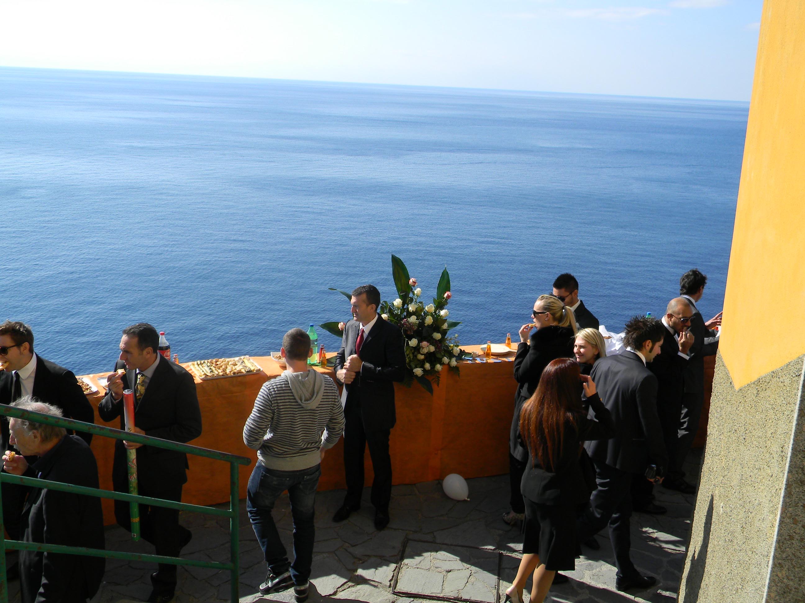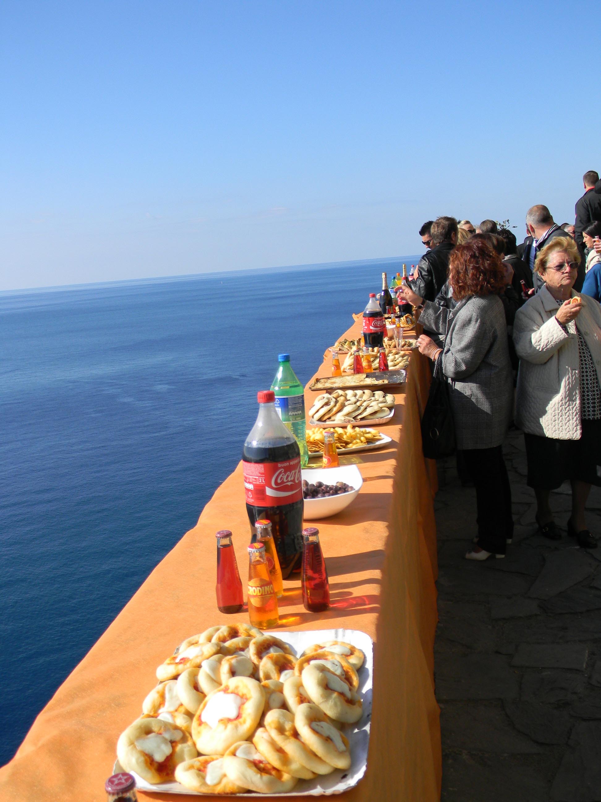 Light cliffside refreshments and Champagne overlooking the sparkling sea, ah. Then on to Monterosso for lobster risotto, ceviche, frutti di mare, shrimp, crawfish and fresh anchovies, salmon crudo and velvety fish paté and mousse. Plus Spanish jamon crudo, a steak course and 10,000 desserts, including mini-wedding cakes and gelato wrapped in hazelnut wafer with dark chocolate. Grappa and coffee.
