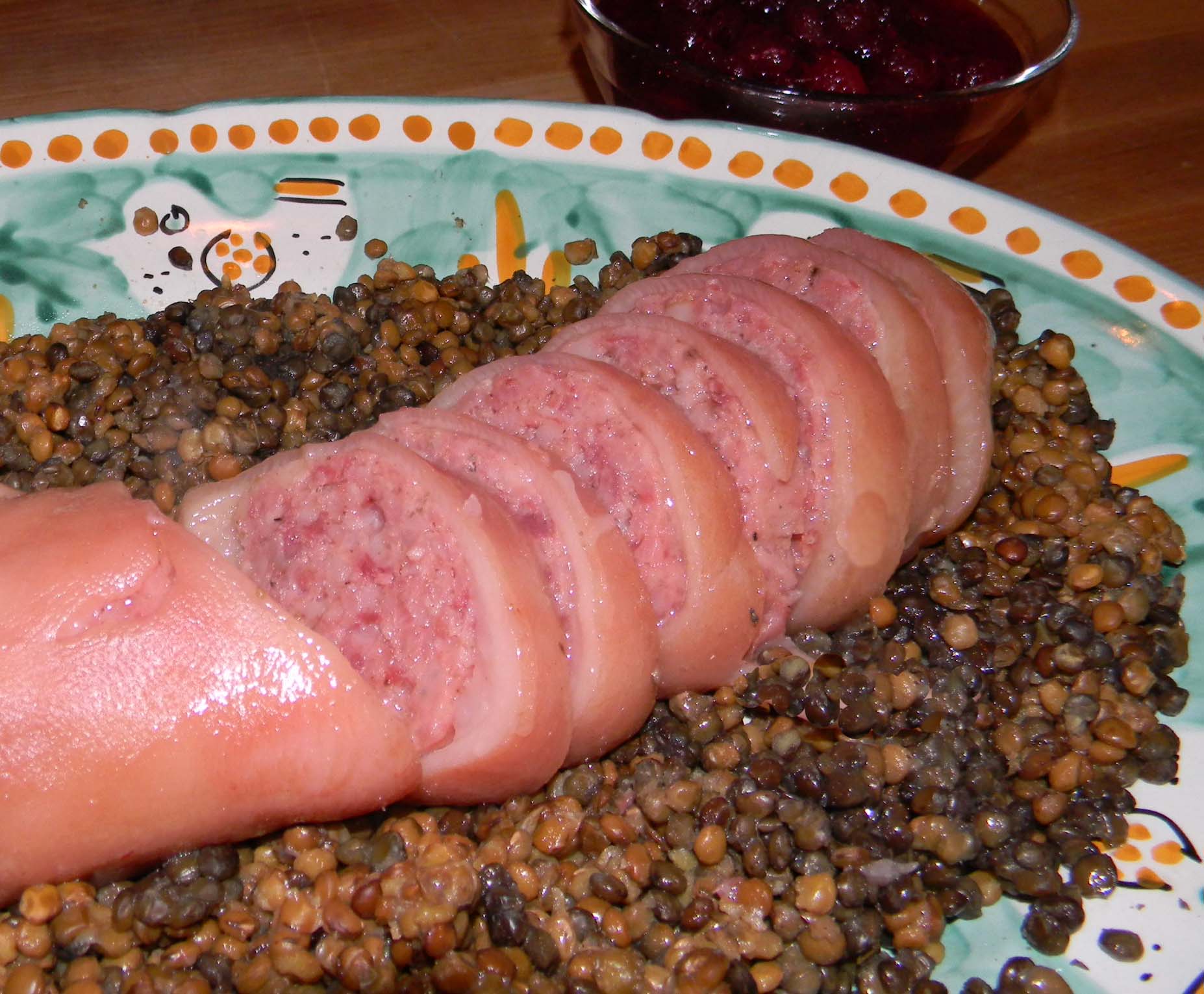 Trotter and lentilsZampone is found at the Italian table on New Year’s Eve the way turkey is found on American tables on Thanksgiving. Precooked and vacuum-sealed in fat and jelly, the Zampone remains soft and juicy  if you follow directions and boil gently. The fat gives Zampone a uniquely unctuous mouth-feel, and the meat stays rosy pink.