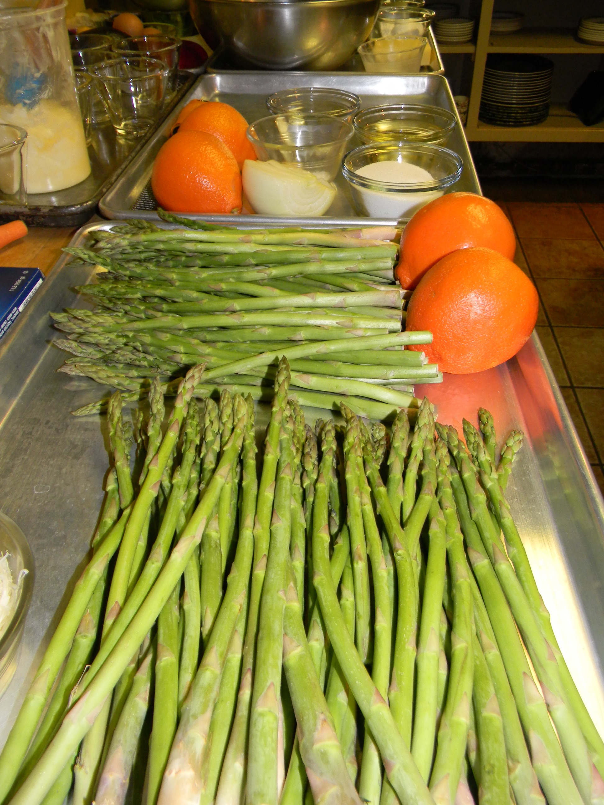 Things move quickly, here, with tips, tricks and a soupcon of technique. Salmon demonstrates how to peel asparagus and better still, tells us why. He shows us how to use a microplane — I’ve been holding mine upside-down for years. He reveals the simple secrets of his go-to dressing, an unfussy emulsion of oil, tangerine juice and a bit of sweet Vidalia onion. Mm.