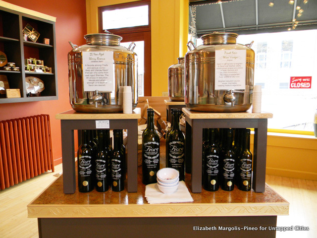 Lined with small steel casks of extra-virgin olive oil and balsamic vinegars, Fiore offers samples of artisanal blends and infusions. Choose a favorite – my newest passion is the cranberry pear white balsamic vinegar, sweetly aromatic – a bright, tasty mixer or “shrub” for vinegar cocktails.