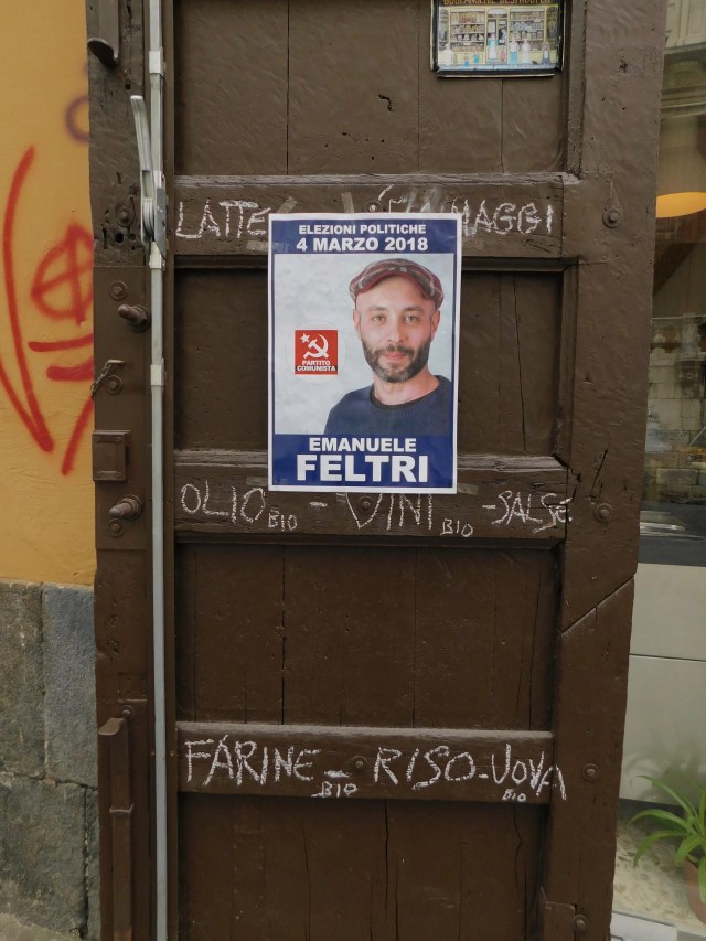 Interesting to be here during a national election, as Italian populists and far-right reveal their mutual discontent with taxes, unemployment and immigration. David has been wearing his “Bernie” shirt which yesterday inspired a €3 discount on a liter of Artumes.